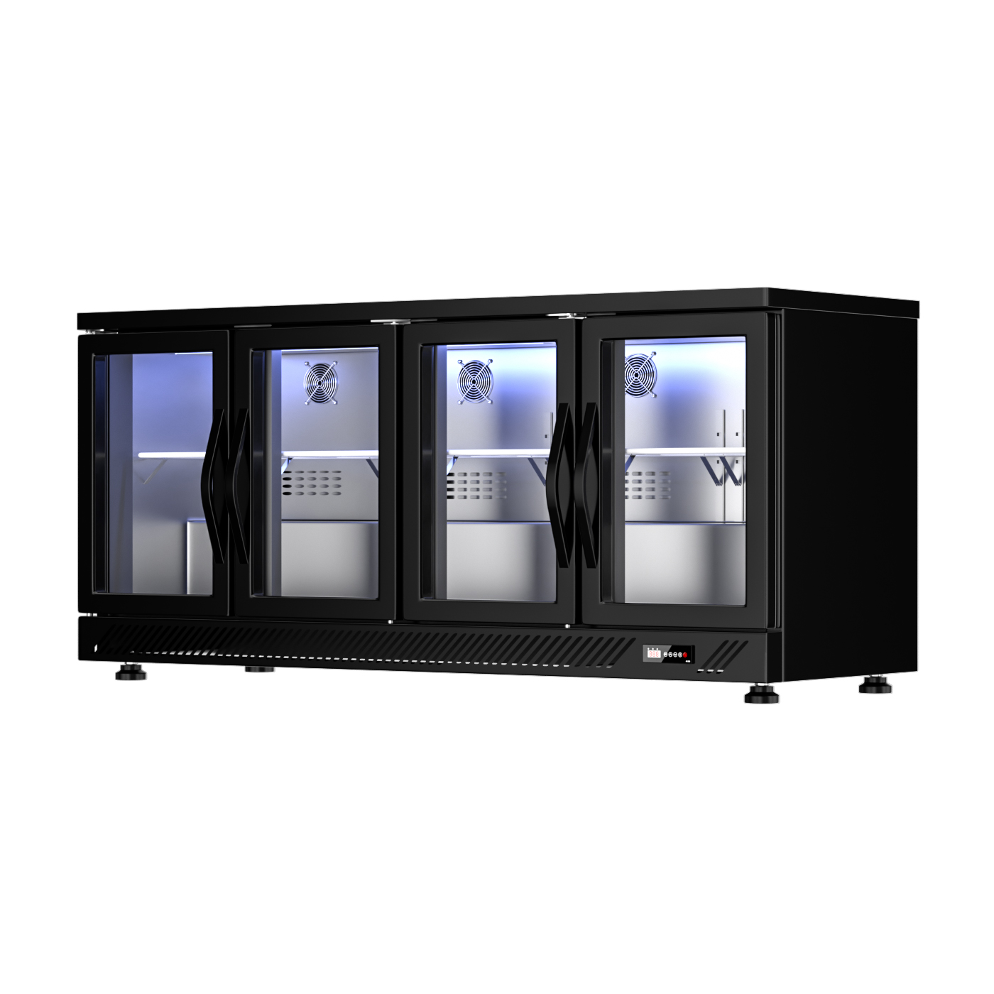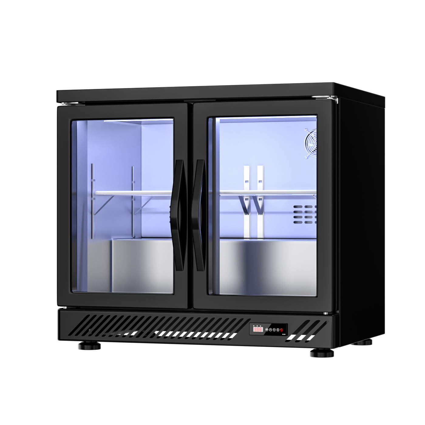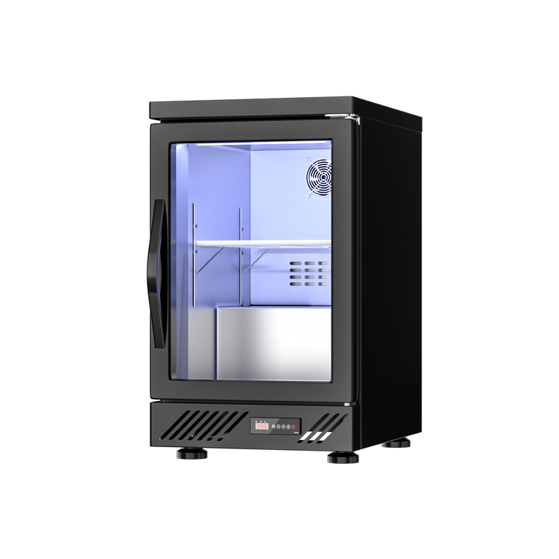 5. Structural Design: opening glass doors, 5-6 layers of adjustable internal shelves, low-profile horizontal cabinet (suitable for bar embedded/desktop placement), with heat dissipation holes and a digital temperature control panel at the bottom