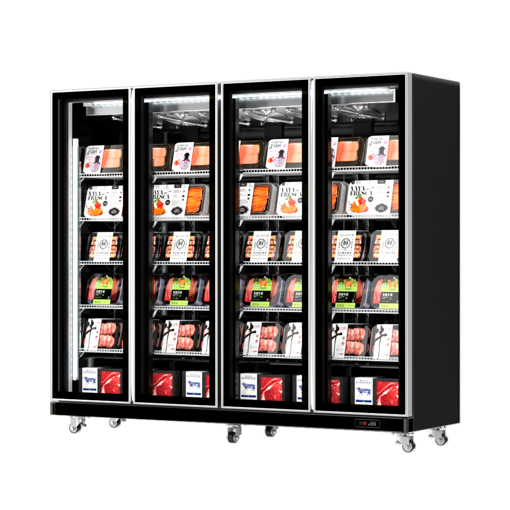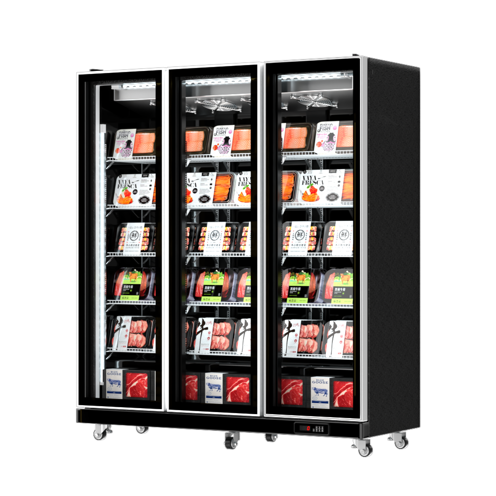 5. Structural Design: Three-door opposite-opening glass doors (with magnetic sealing + buffer hinges), lower-mounted refrigeration unit (mute inverter compressor), 5-6 layers of detachable metal hangers/shelves inside (suitable for boxed/bagged food), heavy-duty universal wheels at the bottom (with brakes + shock-absorbing pads), and an embedded digital display touch temperature control panel at the bottom of the cabinet