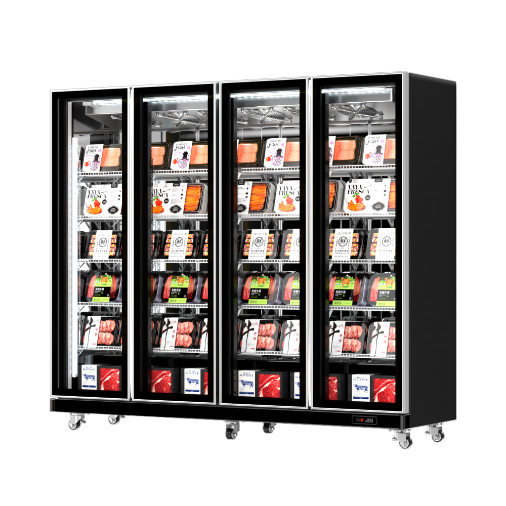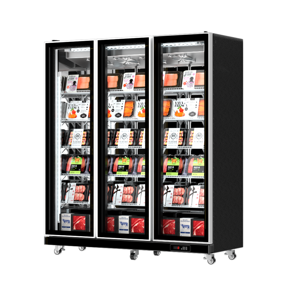 5. Structural Design: Three-door opposite-opening glass doors (with magnetic sealing + buffer hinges), lower-mounted refrigeration unit (mute inverter compressor), 5-6 layers of detachable metal hangers/shelves inside (suitable for boxed/bagged food), heavy-duty universal wheels at the bottom (with brakes + shock-absorbing pads), and an embedded digital display touch temperature control panel at the bottom of the cabinet