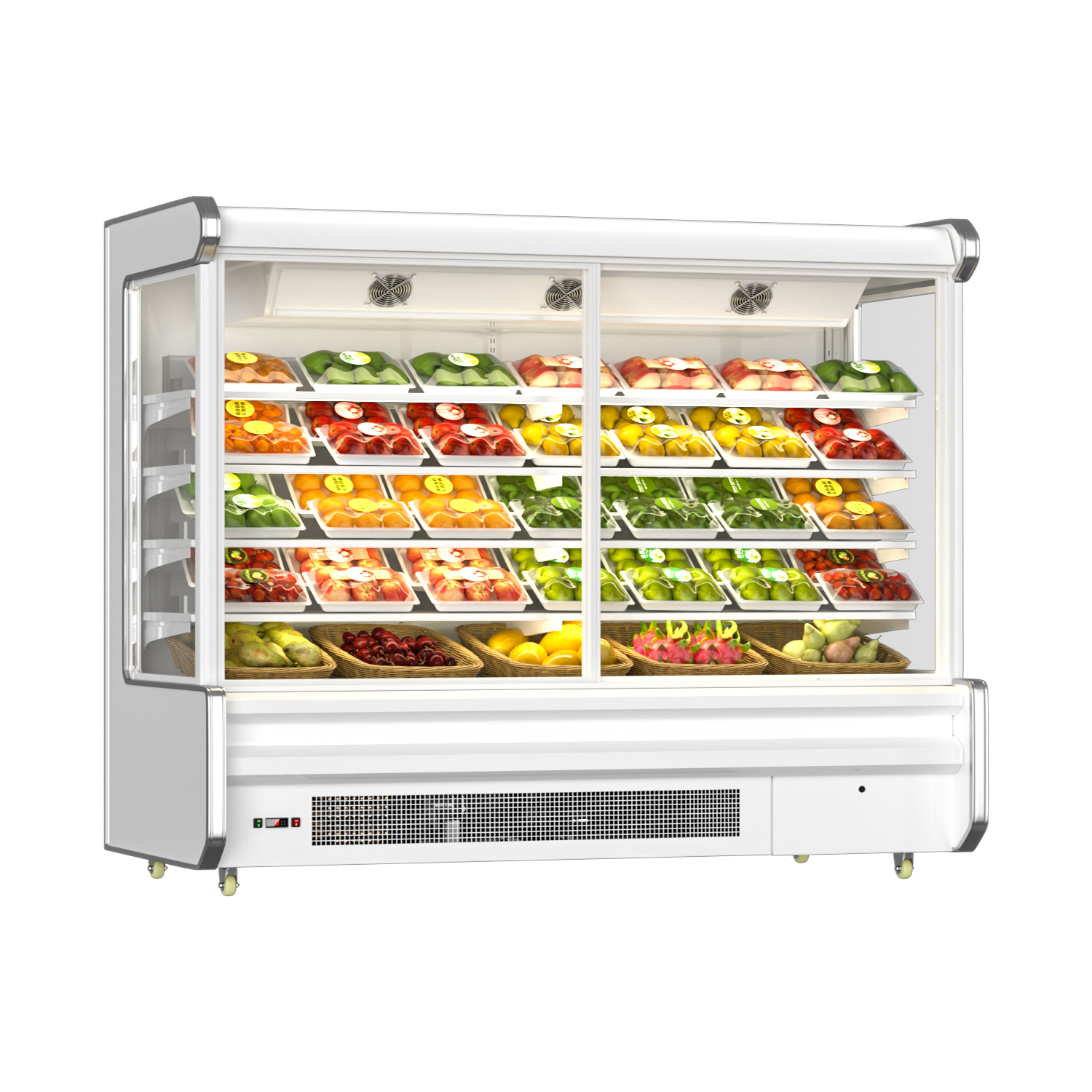 Display structure: multi-layer open arc shelf (conventional 6~8 floors), arc corner modeling, and double-side air outlet design.